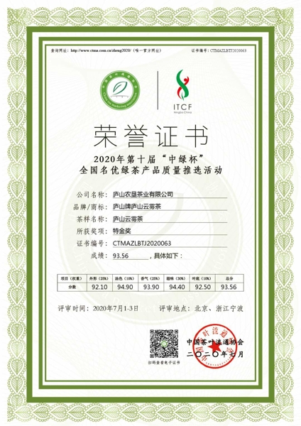 “廬山牌”廬山云霧茶1982年榮獲江西省優(yōu)質(zhì)產(chǎn)品稱號(hào);1983年又被評(píng)為部優(yōu);1985年榮獲國家優(yōu)質(zhì)產(chǎn)品銀質(zhì)獎(jiǎng),且在1990年、1996年兩次復(fù)評(píng)中保持了這一榮譽(yù)稱號(hào);1988年獲首屆中國食品博覽會(huì)金獎(jiǎng);2005年至2007年連續(xù)二屆獲得北京國際茶博會(huì)金獎(jiǎng);2020年獲得第十屆“中綠杯”名優(yōu)綠茶產(chǎn)品質(zhì)量特金獎(jiǎng)。