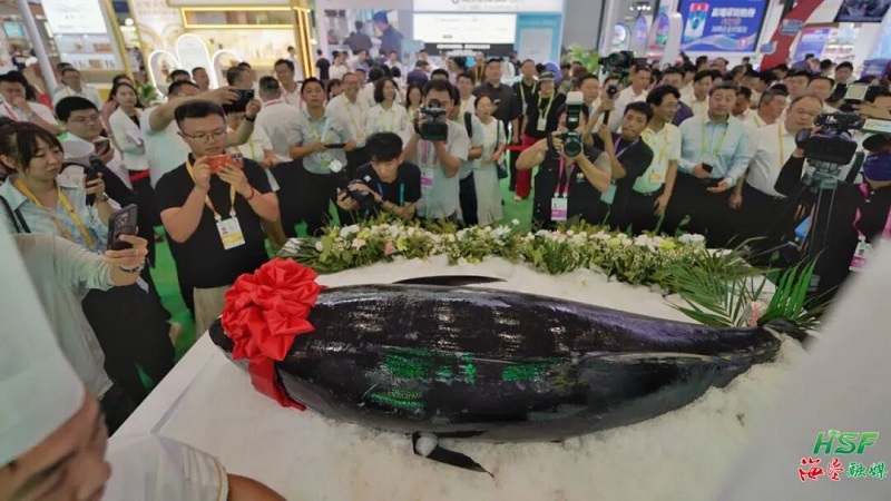 當(dāng)天下午,包洪文、艾軼倫共同敲鑼,宣布“開魚儀式”開始,一條來自西班牙、重達(dá)360斤的藍(lán)鰭金槍魚在海墾館內(nèi)進(jìn)行“開魚秀”,引來現(xiàn)場一眾參觀者的圍觀拍照。專業(yè)師傅現(xiàn)場操刀,將整條藍(lán)鰭金槍魚精細(xì)分解,用這場融合了匠心和品質(zhì)的視覺盛宴,向社會(huì)各界充分展現(xiàn)了海墾集團(tuán)在深海養(yǎng)殖、漁業(yè)貿(mào)易的實(shí)力與影響力。