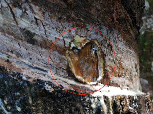割面條潰瘍病主要危害割面,每年3-12月均可發(fā)生,發(fā)病初期在橡膠樹割面新割線上出現(xiàn)一條至數(shù)條排列成柵欄狀的豎立黑線,深達(dá)木質(zhì)部。黑線繼續(xù)擴展成病斑或塊斑,天氣潮濕時,病斑表面長出白色霉?fàn)钗?。皮下溢膠可導(dǎo)致皮層爆裂、隆起,木質(zhì)部變黑褐色。