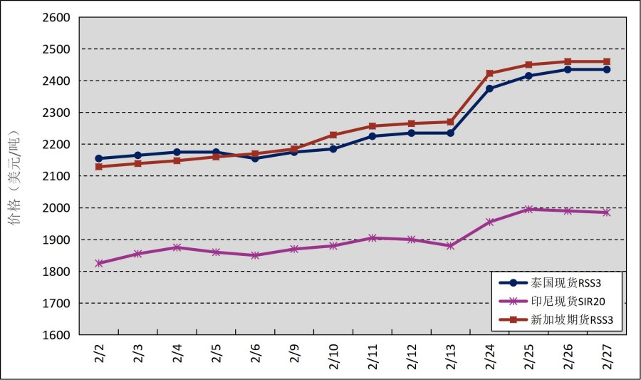 國外主產(chǎn)區(qū):2月,國外主產(chǎn)區(qū)價格呈上漲趨勢。其中,泰國3號煙片膠(RSS3)平均價格2253美元/噸,環(huán)比增加102美元/噸,最高價2435美元/噸,最低價2155美元/噸;印尼20號標(biāo)準(zhǔn)膠(SIR20)平均價格1902美元/噸,環(huán)比增加82美元/噸,最高價1995美元/噸,最低價1825美元/噸。