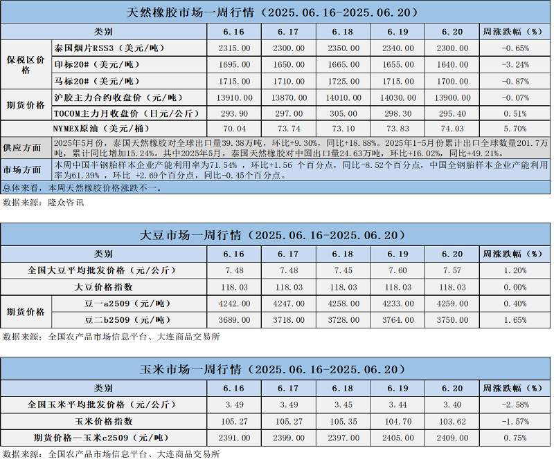 天然橡膠、大豆、玉米市場一周行情(2025.06.16-06.20)