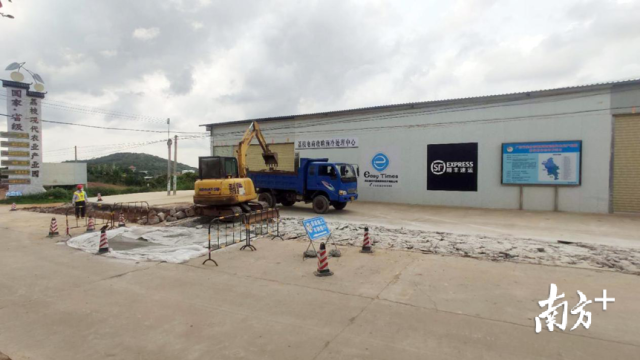 高州市根子鎮(zhèn)易時代荔枝電商產(chǎn)品處理中心前工人們正對路面進行修整
