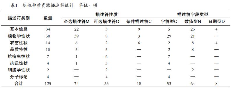 基本信息數(shù)據(jù)對(duì)于種質(zhì)資源研究和共享利用至關(guān)重要。按照植物種質(zhì)資源共性描述規(guī)范的原則要求,統(tǒng)一種質(zhì)資源共性信息,統(tǒng)一描述項(xiàng)目。胡椒種質(zhì)資源規(guī)定了34項(xiàng)基本信息描述符,主要包括種質(zhì)圃編號(hào)、采集號(hào)、引種號(hào)、種質(zhì)名稱、科名、屬名、學(xué)名、種質(zhì)類型、主要特性、主要用途、系譜、育種手段、繁殖方式、采集地、保存單位、圖像和鑒定評(píng)價(jià)機(jī)構(gòu)等,涉及征集、保存、主要特征、用途及共享等多方面內(nèi)容。由于胡椒種質(zhì)資源在國(guó)內(nèi)外均有分布,且野生近緣種資源占有較大比例,因此條件描述符5項(xiàng),主要涉及采集地位置信息以及引種號(hào)和引種外文名,其余29項(xiàng)為必選描述符,均是具有共性的種質(zhì)基本特征及主要特征等(表1)。